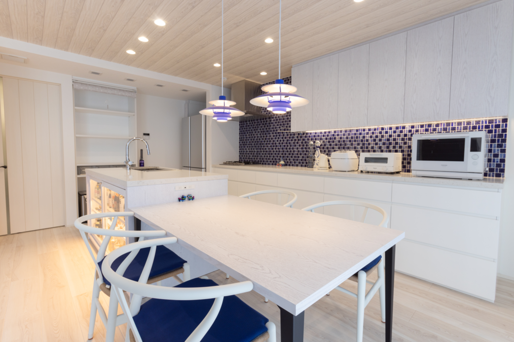 ブルーとホワイトで統一した爽やかなキッチン&ダイニング。