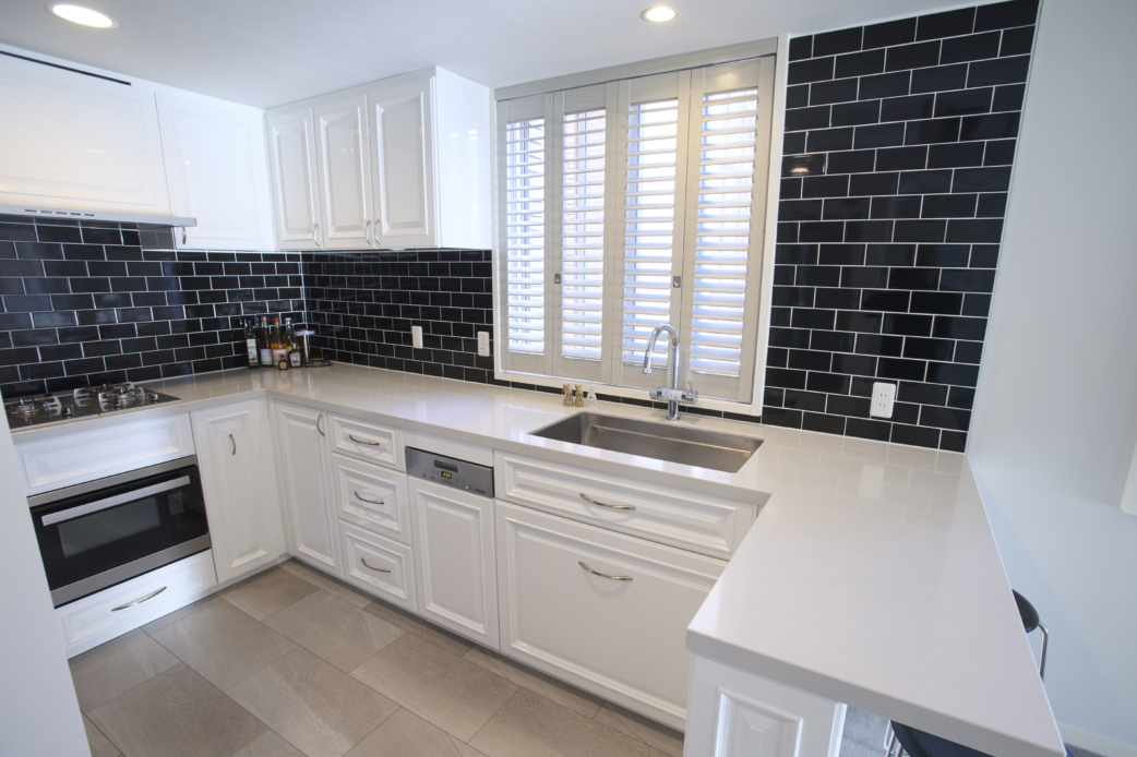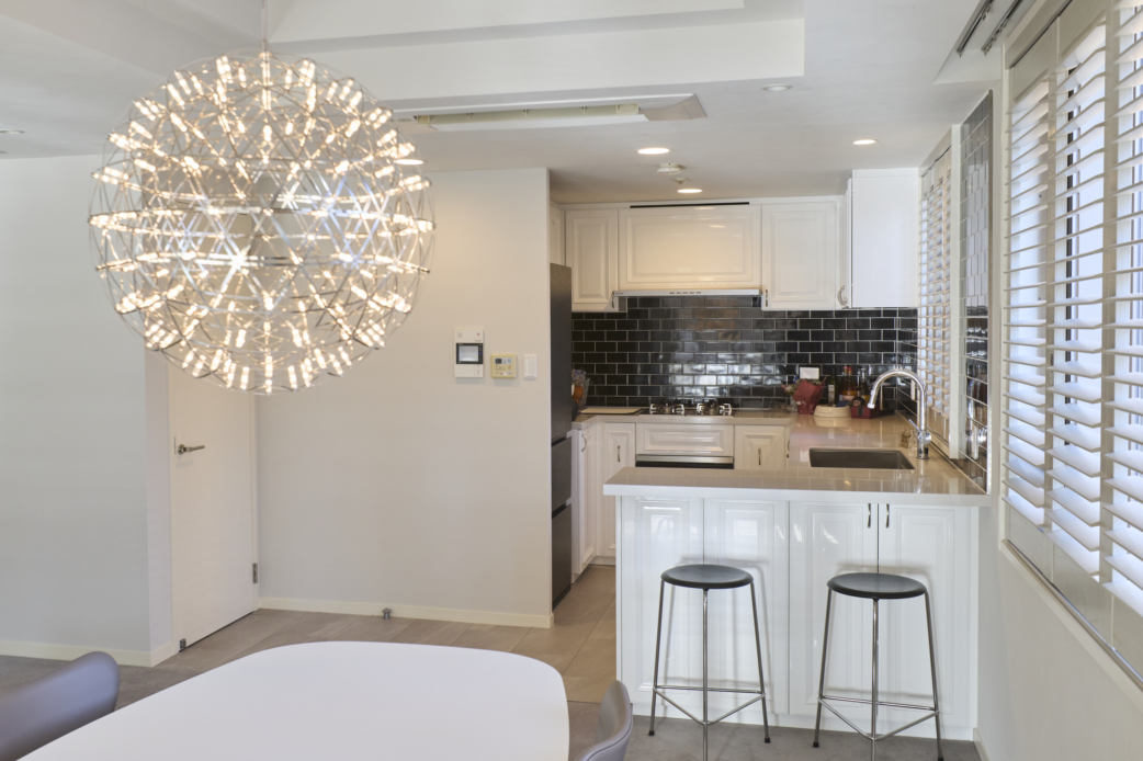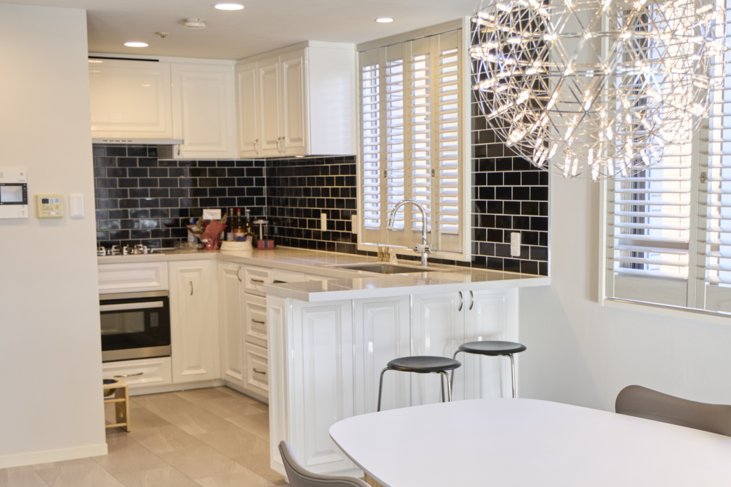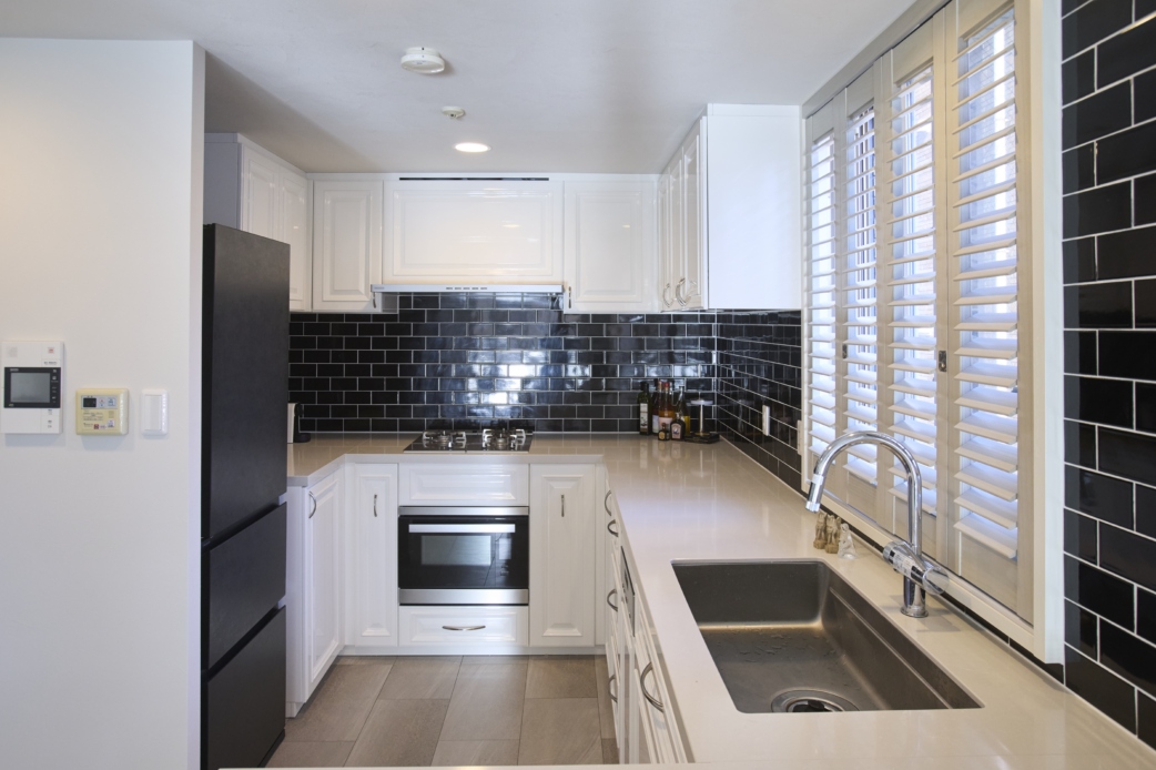 ウッドシャッターとタイルの地中海モダンなキッチン ホワイトのウッドシャッターからやわらかな光が差し込む、ブラックタイルのキッチン。モノクロでまとめた空間に框組扉の立体感がほどよいアクセントとなり、重厚さの中にぬくもりを感じる、洗練された地中海モダンなキッチンです。